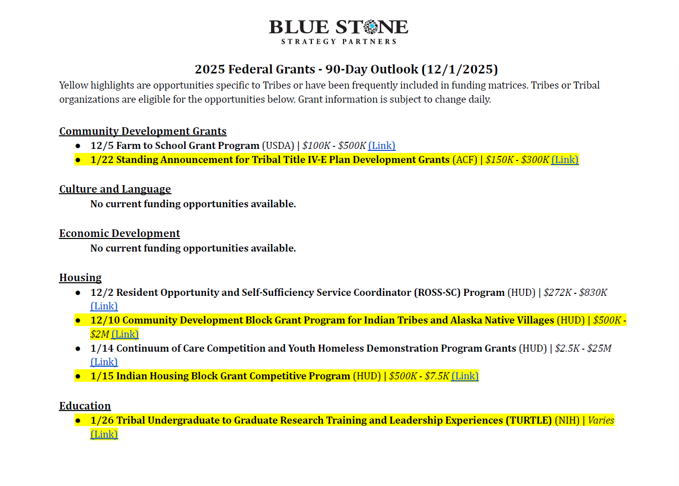 Identify funding opportunities for your Tribe. We have complied funding opportunities that Tribal Organizations are eligible for. We have also highlighted specific opportunities most useful for Tribes. This Grant information is subject to change daily.