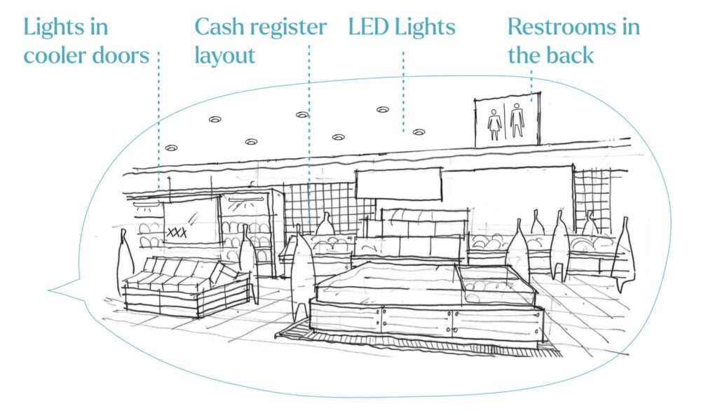Fresh food – A market concept with fresh food communicates a different level of cleanliness and standards to deliver to the consumer. The market concept is a commitment to fresh food, exposed kitchens, and sometimes two food concepts in one market. One food concept could be a branded concept (such as a franchise) that helps you get there faster because people recognize what the brand offers. We always recommend having your own proprietary high-quality food option as well. Fresh food and grab-and-go food will raise average ticket prices, benefiting your operations.